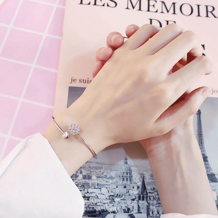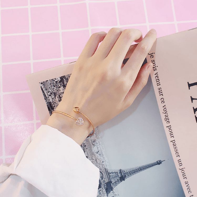 Bangles are a lovely addition to your jewelry collection. This beautiful bangle has hearts at each end of the bangle that meet in the middle y for a delicate yet eye-catching design.