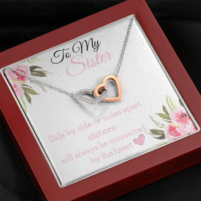 Two gold-plated hearts pending embellished with cubic zirconia stones, interlocked together as a symbol of sister's love.